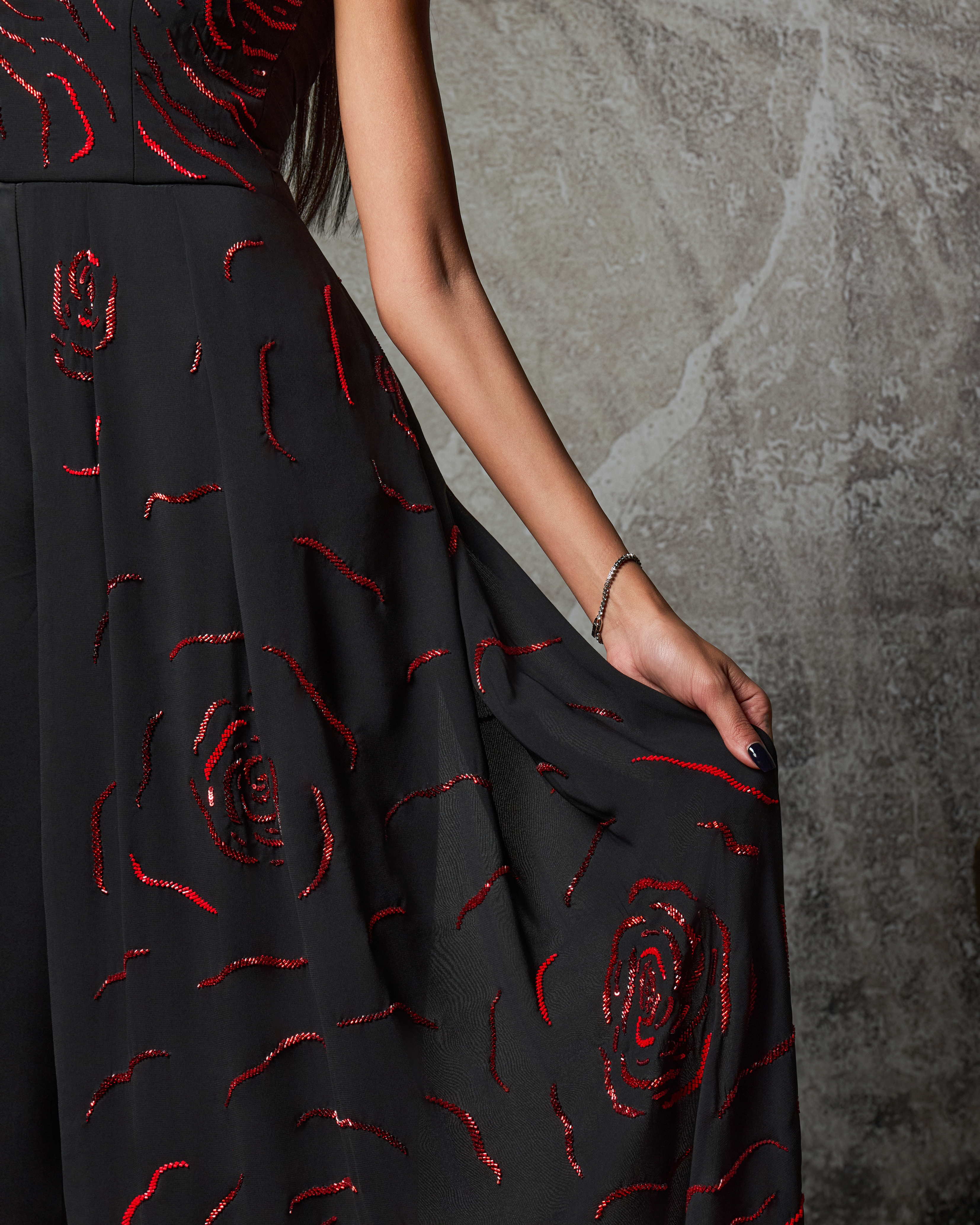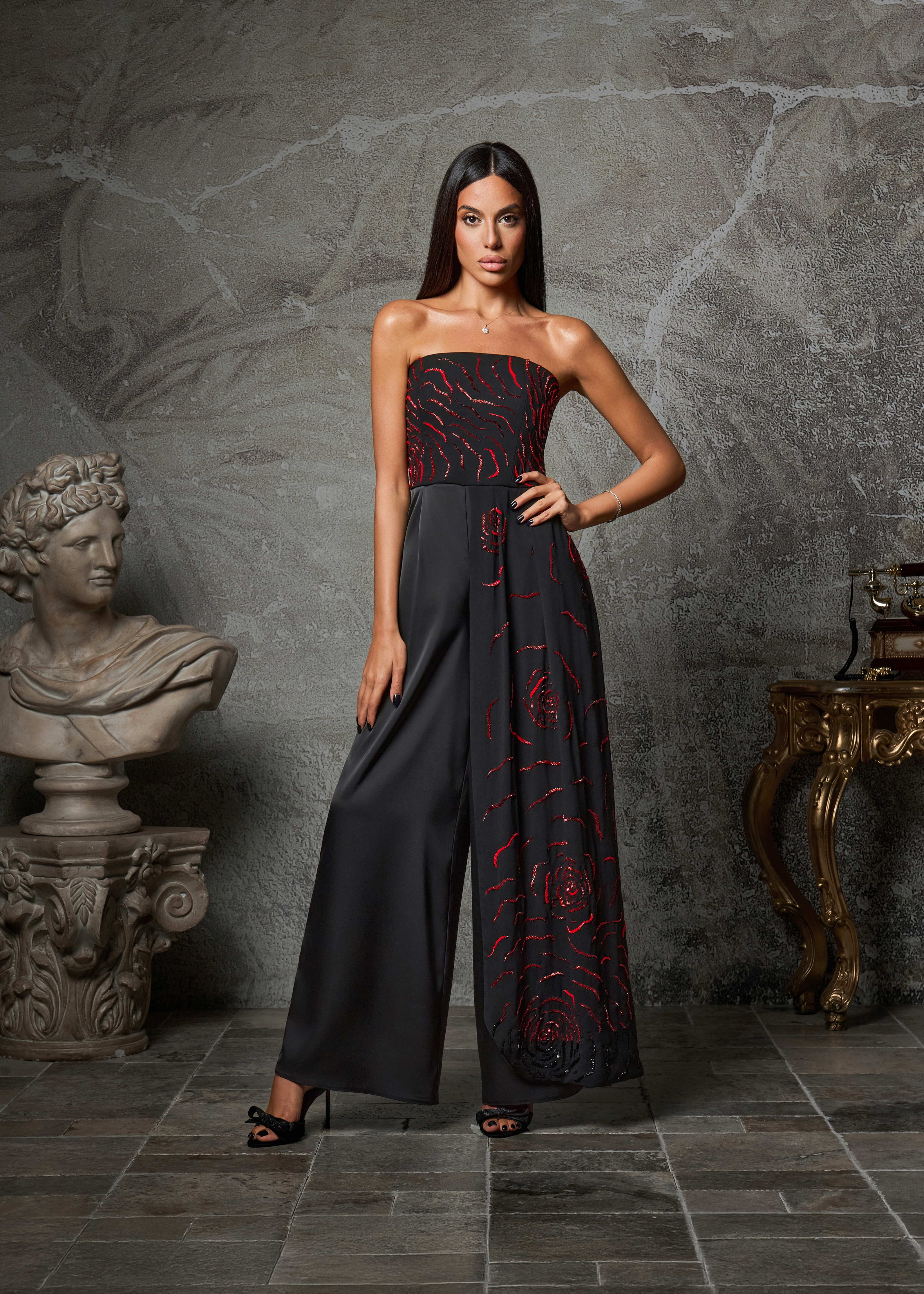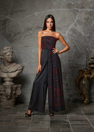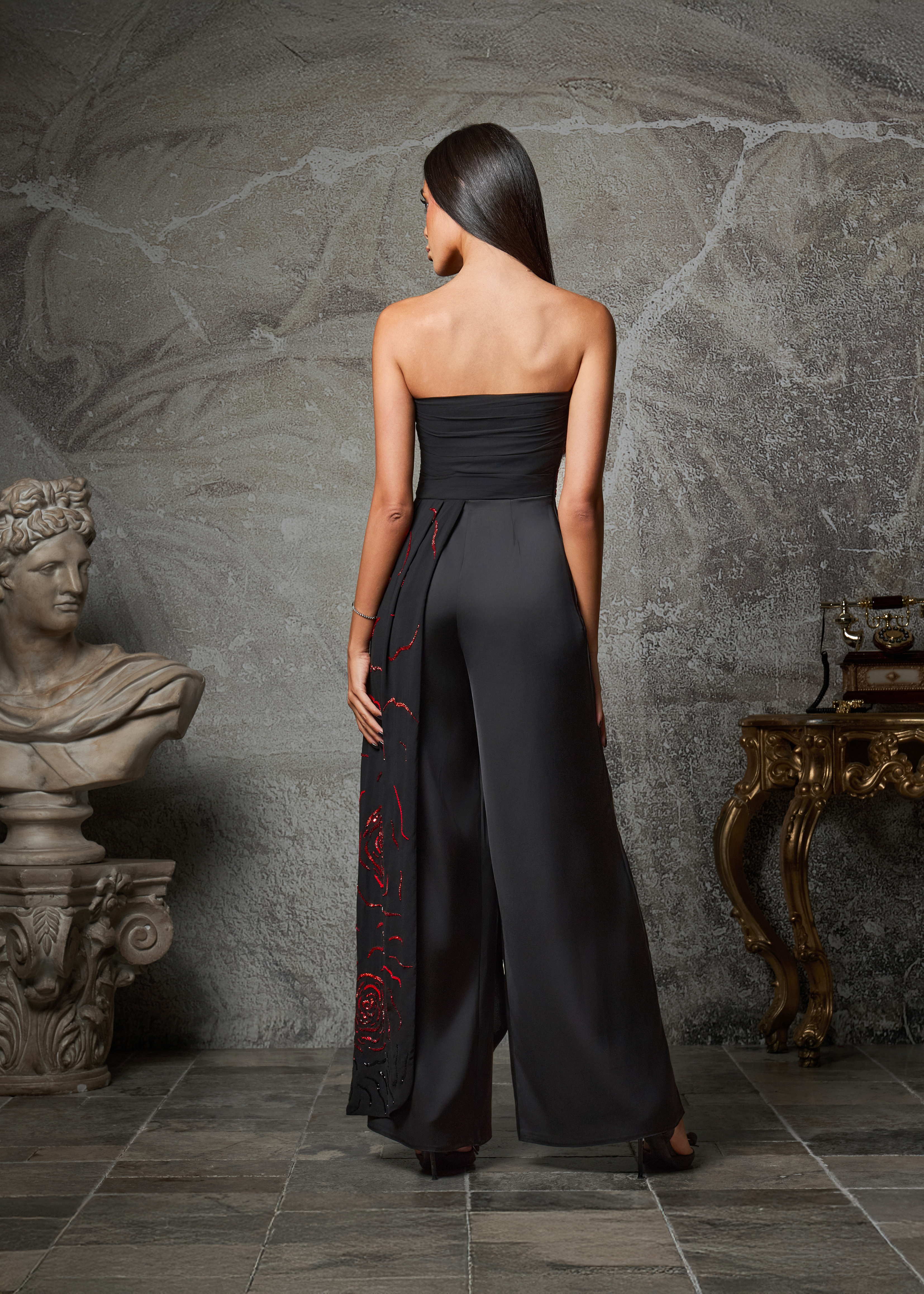 Commanding and refined, the Obsidion Rose is a strapless wide-leg jumpsuit that exudes modern sophistication. Crafted in midnight black, the silhouette is elevated with hand-embellished scarlet rose motifs that cascade across the bodice and flow into one leg, creating a striking play of contrast and movement.