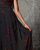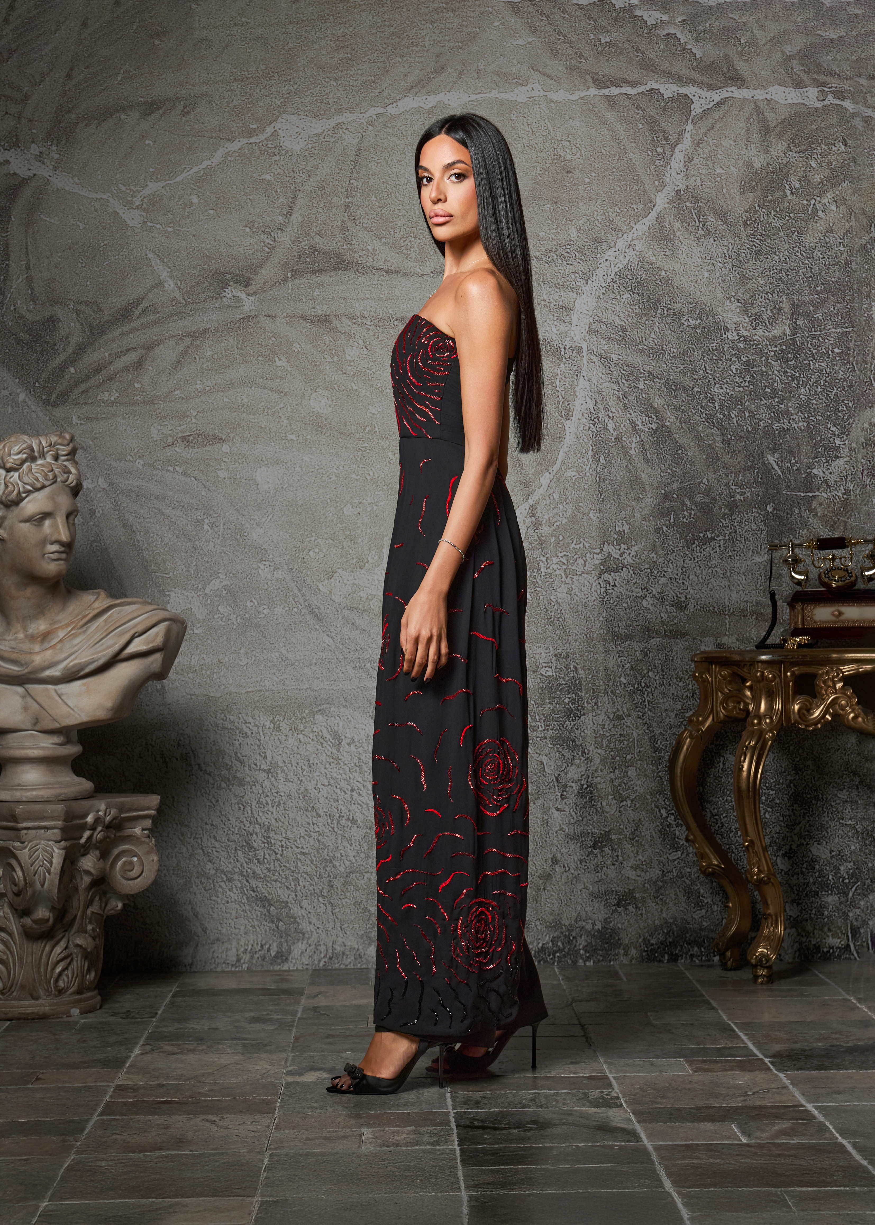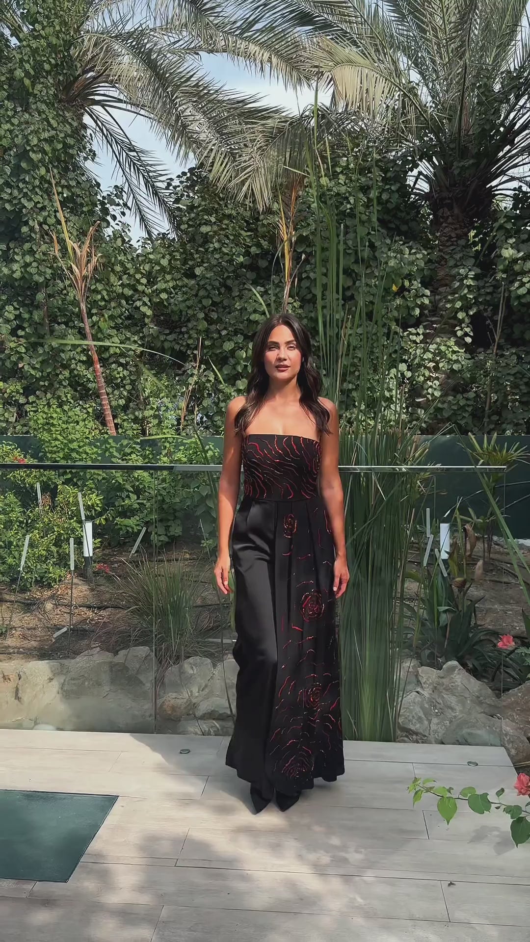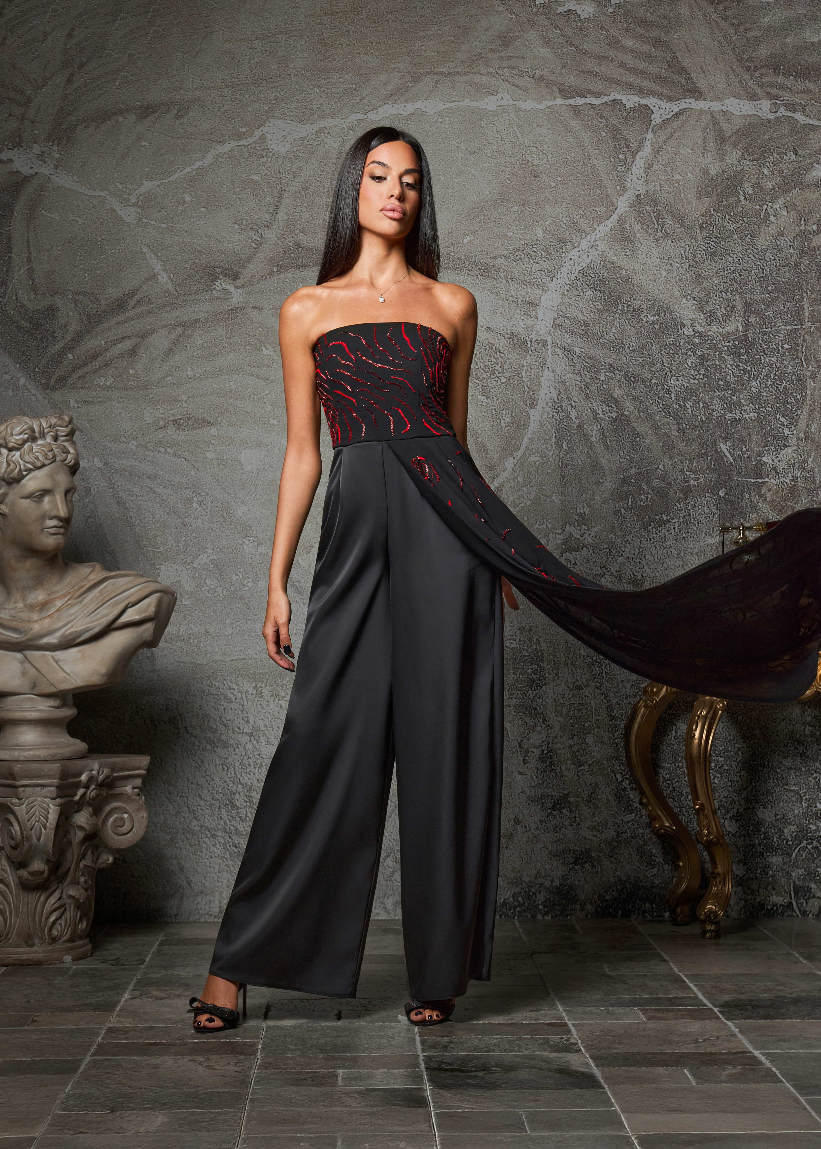 Commanding and refined, the Obsidion Rose is a strapless wide-leg jumpsuit that exudes modern sophistication. Crafted in midnight black, the silhouette is elevated with hand-embellished scarlet rose motifs that cascade across the bodice and flow into one leg, creating a striking play of contrast and movement.