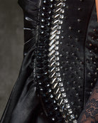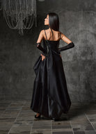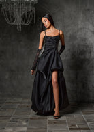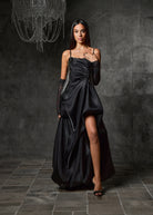 Command attention in this striking black satin embellished evening gown, designed to embody drama and elegance. Featuring a fitted bodice with delicate ruched detailing and shimmering swarovski crystals along the sides, the gown flows into a voluminous skirt with a daring front slit for a bold statement. Slim shoulder straps and a softly curved neckline add a touch of refinement, Finished with a glossy satin sheen, this gown is the ultimate choice for evening occasions where sophistication meets allure. Perfect For: Black-tie events, galas, red-carpet evenings.